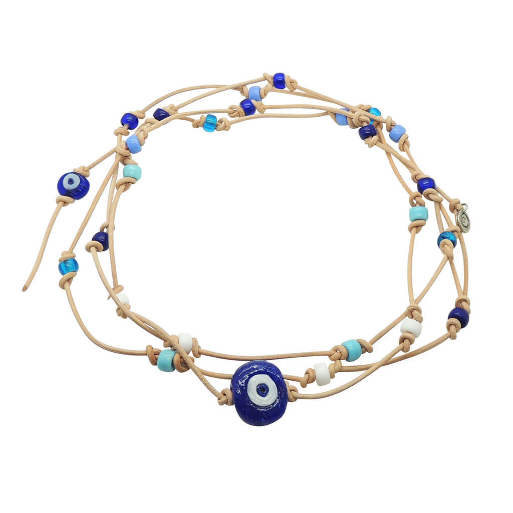 Channel the ancient magic of the Mediterranean with our Aegean talisman leather cord lariat necklace. Centred around a large striking glass evil eye charm - a symbol of protection and intuition, this handcrafted lariat necklace evokes the shifting blues of the Aegean Sea. The smooth leather cord is adorned with chunky Czech glass candy beads in oceanic hues of deep cobalt, sea foam, and white, knotted with intention and spaced with care to echo the rhythm of the tide. A smaller glass evil eye charm anchors one end of the cord necklace for an added layer of symbolism. Wear it draped as a lariat necklace or wrapped around the wrist as a bold, talismanic bracelet: either way, this Aegean talisman necklace is a versatile piece, designed to shield, shine, and mesmerise.