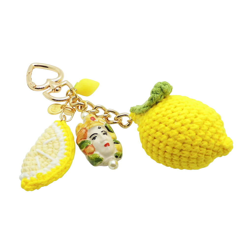 Bring a taste of Sicily to your accessories with our Sicilian limone & testa di moro bag charm, an enchanting blend of vibrant culture and intricate craftsmanship. This bag charm features a beautifully crocheted Sicilian lemon and lemon slice, paired with a small ceramic testa di moro moor head charm. Available in your choice of male or female head and in a range of colours, the testa di moro charm adds a touch of timeless Sicilian heritage. A mini resin lemon adds a playful touch, creating a perfect harmony of tradition and modern charm. This bag charm is adorned on a chunky gold-plated brass chain and finished with a heart-shaped carabiner clasp, offering both elegance and functionality. This is more than just a bag charm - it’s a statement of Italian style and craftsmanship.
